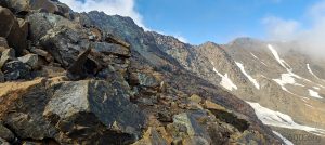 The steep scree section is tough, especially if the barely visible trail is ignored. We each choose our own path. Steven and I move to the left, scrambling rocks, which look more stable and appealing than the loose scree. This section is not very long, maybe a couple of hundred vertical meters. Once we climb to the edge of the summit plateau, it becomes an easy walk again.