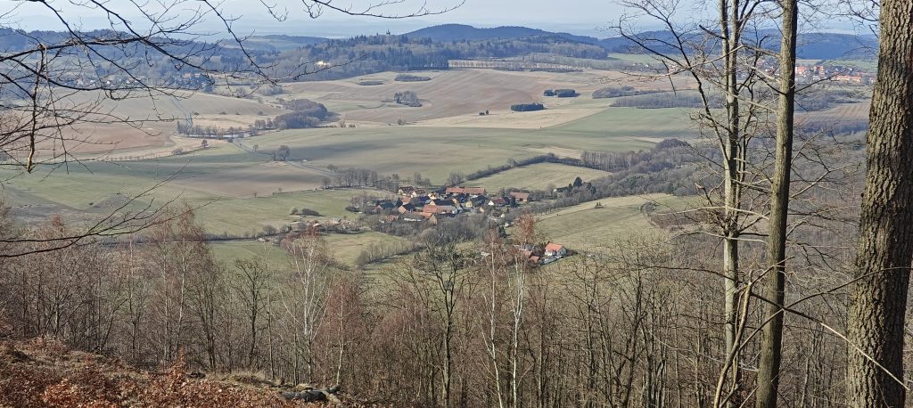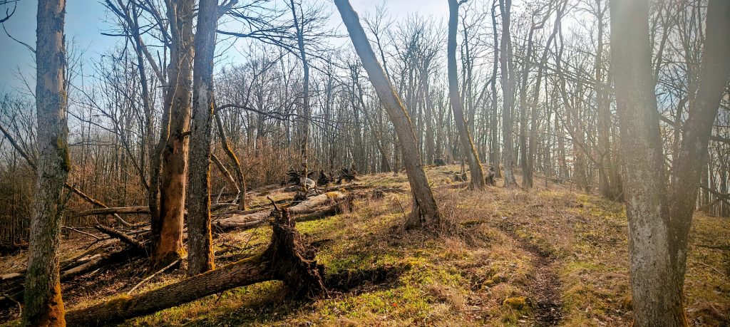 Even with such a short approach, Doubrava felt more open than the map first suggests. The summit ridge is wooded, but in mid-March the leafless trees left plenty of room for views into the surrounding countryside. Through the trunks I could look out across villages, fields, and rounded hills between the Plzeň and Klatovy area, and the hill’s independence made those views feel earned rather than accidental. The ground also had the bonus of early spring detail, with hepatica flowers growing along the path. It was a small thing, but on a short peak like this, details matter.