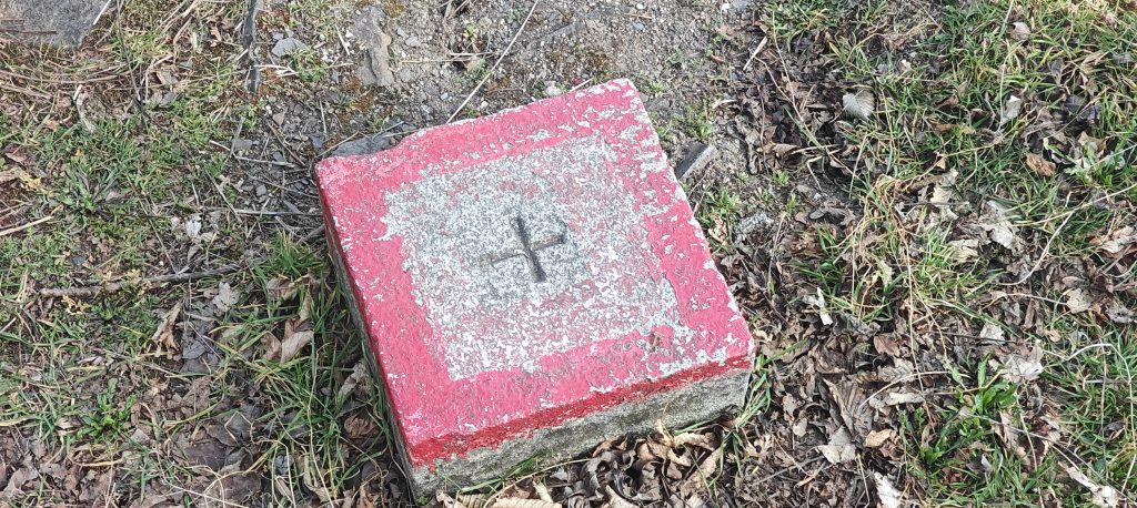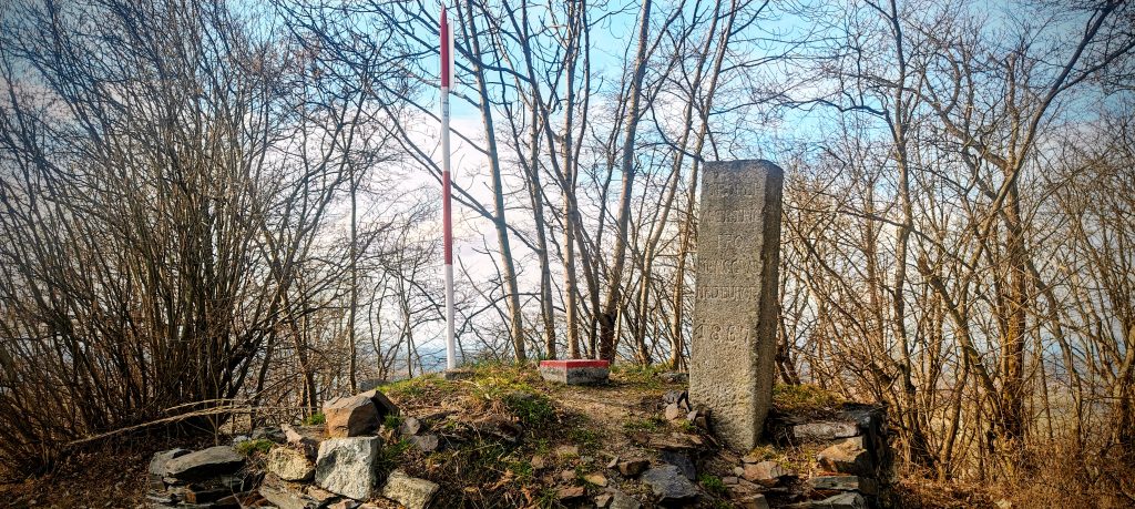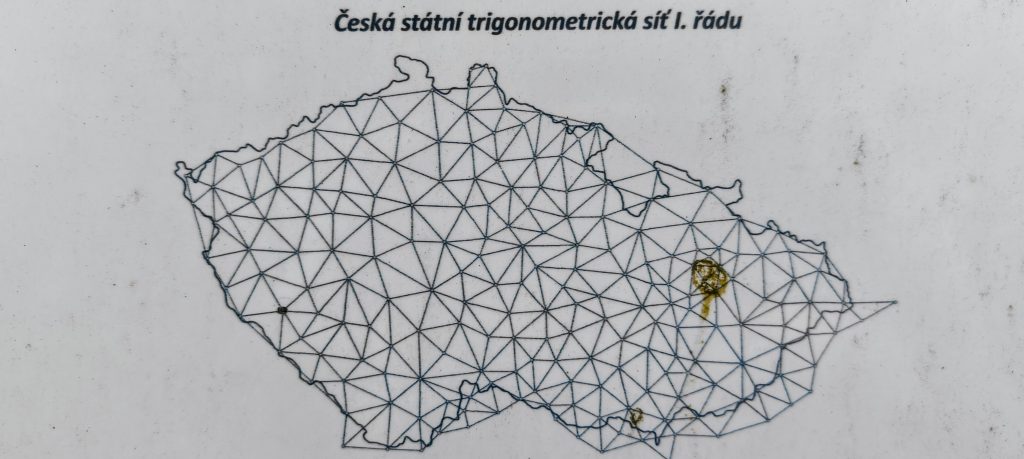 Near the top, Doubrava becomes far more distinctive than a standard forest P100. There is a fenced antenna installation, a picnic table, a paragliding launch just below the crest, and most interestingly a cluster of survey markers that gives the summit area a proper identity. The red-and-white mast, the red-painted concrete trig block with its cross, and the older stone pillar all show that this top had geodetic importance long before it acquired any value as a list summit. I used the close-up marker photo rather than the larger information board, but the small diagram is enough to point toward a broader Czech context: trig points like these belong to the long-established national triangulation framework used to anchor mapping and cadastral control across the country. Doubrava is not just a summit with hardware on it. It is a summit that was measured seriously.