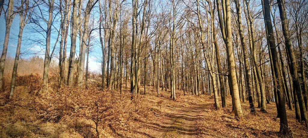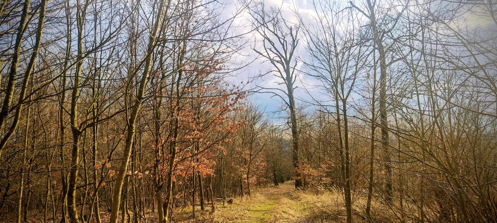 The walk up was easy and pleasant in the way short forest P100s sometimes are when they do not try to be anything more elaborate. The route climbed through quiet woodland on a broad road, with planted pines in places and leafless deciduous trees giving the hill a more open feel than a summer ascent probably would. Underfoot it was dry and straightforward. Conditions were mild and dry, so nothing in the weather complicated the outing. There was no navigational puzzle on the ascent. I simply followed the road upward and let the mountain reduce itself to what mattered: the final few metres around the summit area.