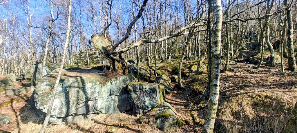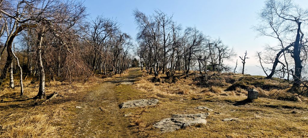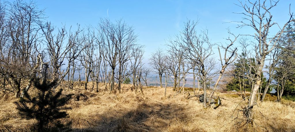 Above the climb, Děčínský Sněžník felt less like a tidy pointed summit and more like a broad high rim and plateau. In places it had a slightly weathered, almost tundra-like early-March feel: dry yellow grass, bare birches, patches of moss, low vegetation, open ground, and scattered rock. The weather made it even stranger in a good way. It was warm enough for short sleeves, and winter survived only in a few traces of ice in wet places. I also noticed signs of animal activity, including what looked like wild boar traces, although the wildlife did not exactly have the mountain to itself. I passed around fifty people, with a noticeable mix of Czech and German visitors, which suited the location on the Czech-Saxon borderland.