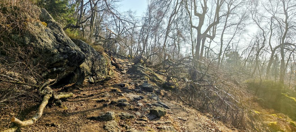 The upper area is also where the mountain becomes more interesting historically. Děčínský Sněžník is not just another convenient morning loop above a parking lot. It is the highest table mountain in the Czech Republic and the highest summit of the Elbe Sandstone Mountains, which explains the mountain’s broad shape, flat top, and sudden sandstone edges. The German name Hoher Schneeberg means High Snow Mountain, while another Czech name, Vysoká Sněžka, points in the same direction. Despite the name, there was very little snow left on the plateau.