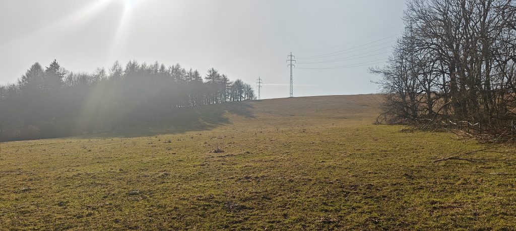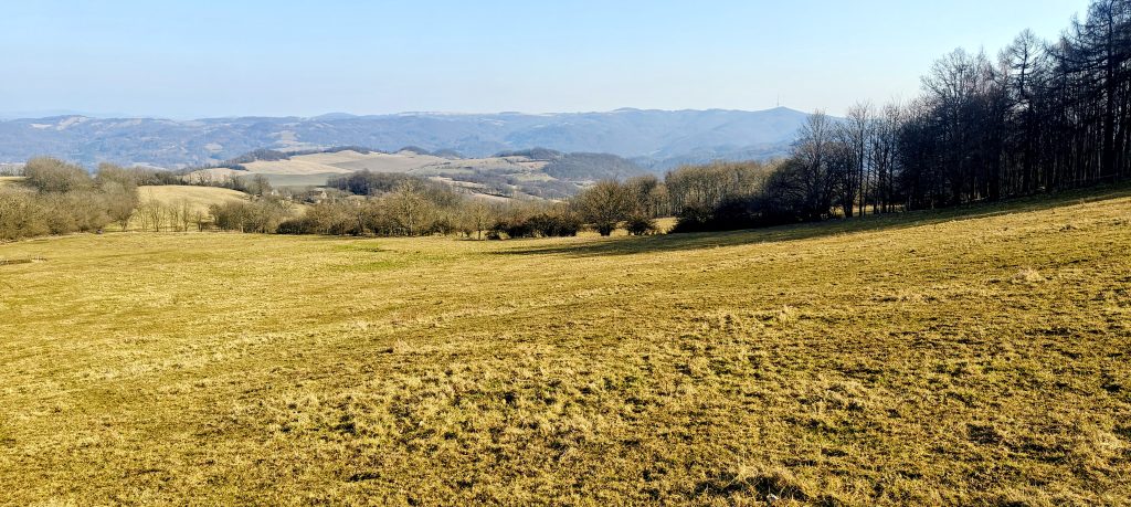 I parked by the road west of Javory and took the direct line across the meadow rather than using a more formal approach. There was not much room to leave a car on the side I used, although it looked as if there was more space from the opposite approach. Once I was there, the direct line made the most sense. The route was simple: grassy slope, open ground, and a steady pull toward the skyline. There were faint traces of tracks here and there, but in dry conditions it was mostly a matter of walking uphill and not overthinking it, which is a nice luxury before the human race inevitably ruins everything with too much infrastructure.