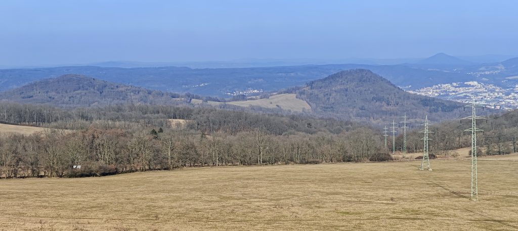 Javorský vrch sits above the village of Javory between Děčín and Ústí nad Labem, and the openness of the summit gives it a wider reach than many higher but more enclosed neighbours. The older German name Lerchenberg, roughly “Lark Mountain”, suits it rather well. This is not a hidden forest top. It is an exposed pasture hill, breezy and outward-looking, with broad views across the Bohemian uplands and toward busier valleys beyond. One of the nice details on a multi-peak day was being able to look back at hills I had already visited, including Lotarův vrch on the left and Chmelník on the right in the wider panorama. That gave the summit a satisfying sense of continuity rather than making it feel like just another short stop between roads.