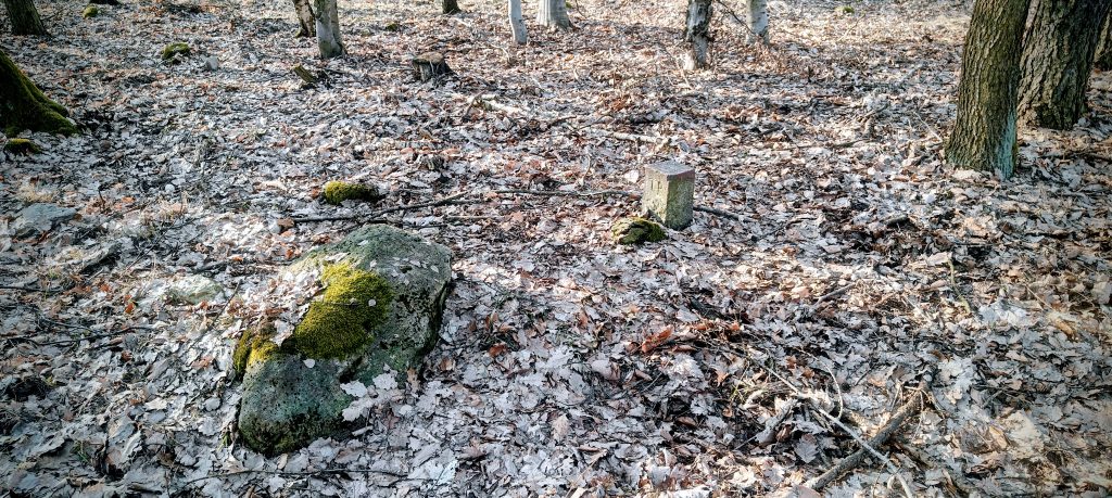 That is the main point worth knowing about Radešín. The summit area is awkward. The power line cuts across the top, and there is a small earth hump near the clearing that could easily fool you into thinking you are done. I do not treat that mound as the natural summit. It looks disturbed, most likely shaped during the construction of the line. The true top, in my view, is a few metres away in the forest, where I found a small concrete trig point and a marker in the trees. That spot matched the summit logic much better than the pushed-up ground by the corridor. There are no grand summit views from the exact high point, just beech woods, leaf litter, and the usual mild satisfaction of locating the correct spot instead of the convenient fake one.