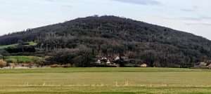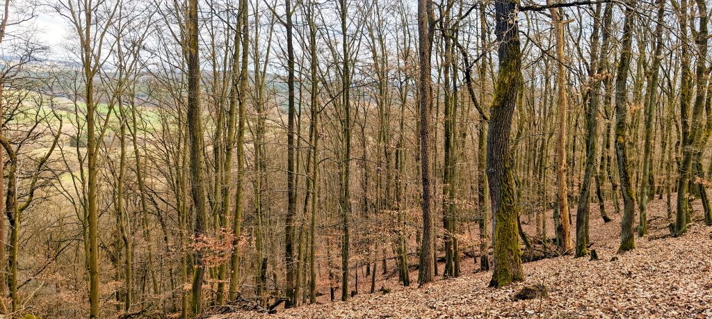 Stramchyně is not a viewpoint peak in any grand sense. The summit is wooded, and on this visit the hill’s value came much more from topographic definition and summit character than from open panoramas. Still, the setting is clear enough from the route and from the map logic of the day. This is a compact wooded dome above Červené Poříčí and the Úhlava valley corridor, with Borovy, Lhovice, and the low ridges of the surrounding countryside close at hand. In March, with the trees still bare, the woods felt open rather than claustrophobic, and the dry leaf litter kept the whole outing fast and clean. That mattered. A short P100 does not need scenery to justify itself if the ground is pleasant, the line is repeatable, and the summit is actually worth finding.