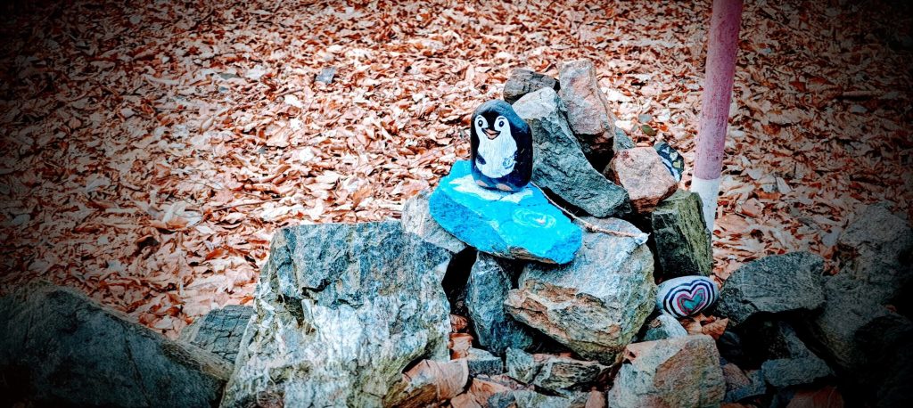 That summit setup gave Stramchyně far more identity than its short route would suggest. There was a fire ring near the top, ground torn up nearby in what looked very much like boar rooting, and a cairn decorated in a way no one would mistake for official survey infrastructure. The most memorable detail was a painted penguin perched on a blue stone among the rocks. It was ridiculous in a harmless, summit-improving way. The hill also had a few older stones scattered around the crest, and the surrounding ground was broad enough that the exact natural apex did not feel dramatically sharper than the cairn site. Still, the cairn and pole made the summit logic good enough on the ground. My highest recorded GPS point was 546.6 m at 49.508854, 13.286785, a little above the mapped 543 m in the usual way GPS likes to flatter short forest summits.