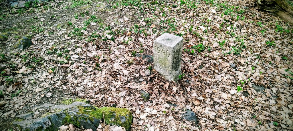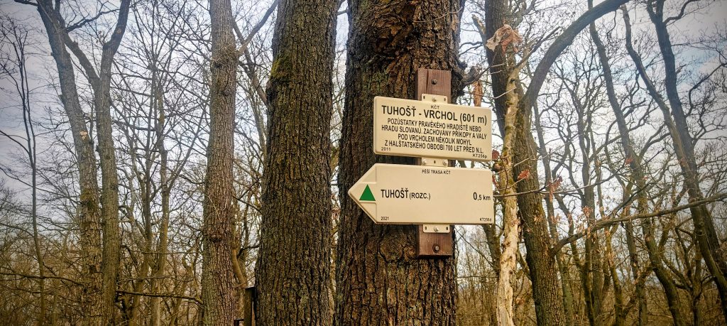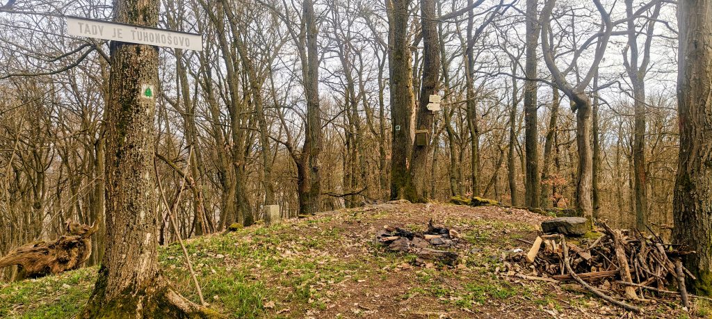 The summit itself turned out to be better furnished, and more memorable, than I expected from such a short stop. It is a wooded top rather than a viewpoint summit, but it has enough going on to feel like a real destination. There is a summit sign naming Tuhošť at 601 m, a register box, a thermometer, an old concrete marker dated 1940, and a small cleared crest with a fire ring and stacked wood. One sign also notes the remains of an early medieval hillfort or Slavic stronghold near the top, with preserved ditches and ramparts below the summit. That detail gives Tuhošť more historical weight than the average minor P100. It is still a quick forest summit, but not an anonymous one. My highest recorded GPS point was 603.1 m at 49.491811, 13.260555, a little above the signed elevation in the usual harmless way GPS likes to flatter people.