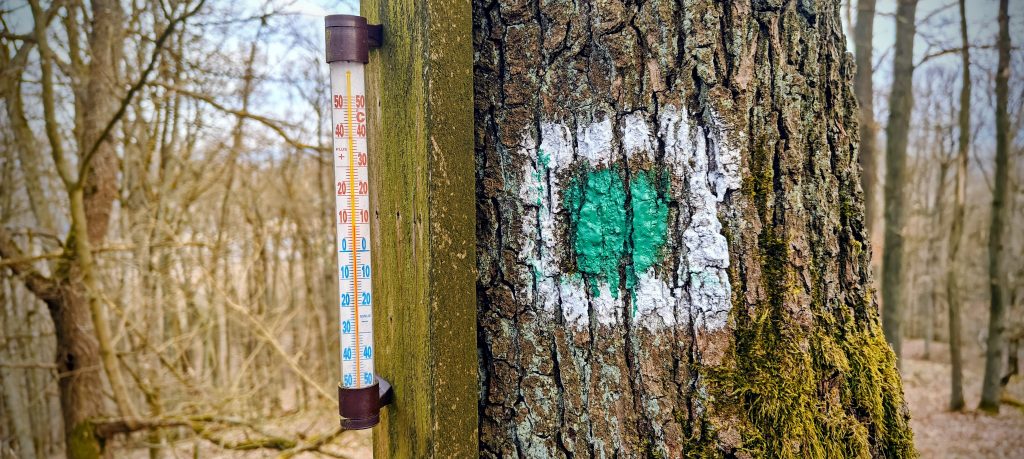 Even though the summit is wooded, it was not completely closed in on this mid-March visit. The trees were still bare enough that small gaps opened toward surrounding hills, which is probably more than the mountain gives in summer. Tuhošť is not a panorama summit, so there is no point pretending otherwise, but the filtered views were enough to remind me where I was: in the compact hill country above Švihov and Mezihoří, where wooded domes rise out of farmland and villages rather than out of some wilder mountain architecture. The thermometer reading, around 9 to 10°C, matched the feel of the afternoon exactly. Mild, dry, and easy moving. Not scenic in a theatrical sense, but comfortable and efficient.