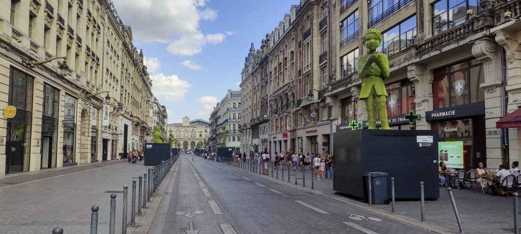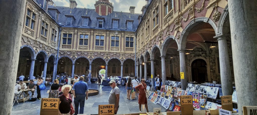 The Porte de Paris, also known as the Porte des Malades, is a gate in the city walls of Lille, built at the end of the 17th century to celebrate the victories of Louis XIV.The Palais des Beaux-Arts de Lille is a municipal museum dedicated to fine arts, modern art and antiques. It was founded in 1809 by order of Napoleon I as part of the popularisation of the arts.The church of Saint-Maurice is a Gothic hall church. It was built over four centuries, from the end of the 14th century to the end of the 19th century.Rue Nationale 1.8 km long, it is one of the main arteries of the cityThe Vieille Bourse (Old Stock Exchange) is a landmark of the city centre, located between the Grand Place and the Place du Théâtre. It is made up of 24 identical buildings around an inner courtyard which serves as a meeting place for booksellers, florists, chess players and tourists and is served by the Rihour metro station.The Opéra de Lille is a neo-classical opera house built between 1907 and 1913 and officially opened in 1923.Rue EsquermoiseOld books market at Vieille BourseLes Fusillés Lille is a sculpture on the Daubenton square commemorating the execution by the Germans of five members of the First World War Resistance, including the young student Léon Trulin.