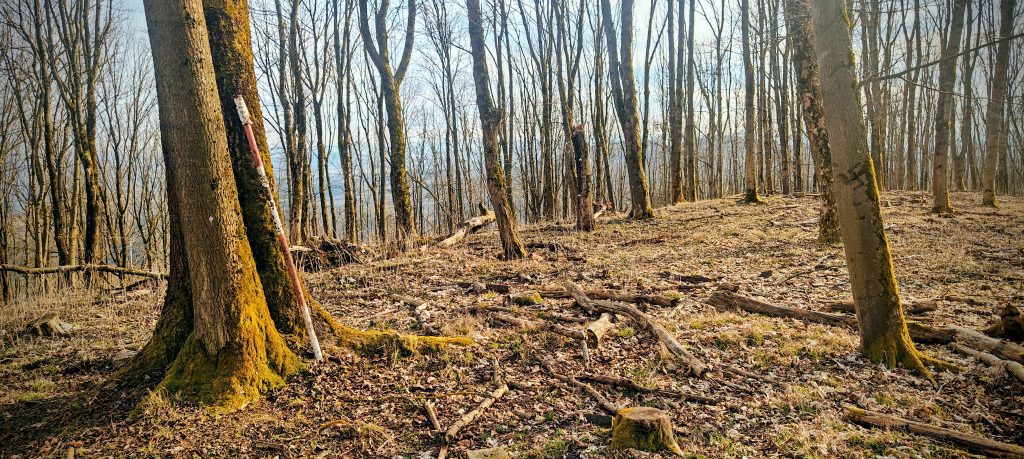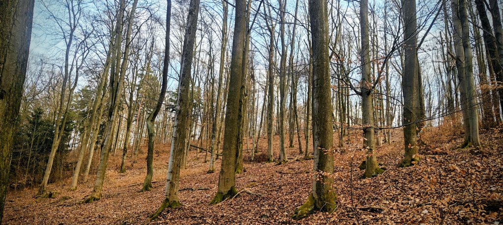 That mattered because I had managed to drive much closer to the mountain than expected. I parked at a forest-road junction on the west-northwest side of the hill and from there the outing shrank to just 1.61 km in total. On paper the lower line looked like a road. On the ground it was closer to an old forest track reduced in places to a path, easy to follow but no longer a road in any normal sense. The climb was gentle and direct, mostly through open beech woodland with dry leaf litter underfoot and the kind of mild, bright mid-March weather that makes even a short ascent feel clean and pleasant rather than perfunctory.