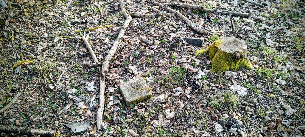 Higher up, the route improved rather than deteriorated. A clearer line developed along the upper ridge, and in one section the old track had enough stonework at the edges to suggest that it had once been built with more ambition than a casual woodland path. I had the sense that something more substantial may have existed here in the past, even if the present-day use is much simpler. Foresters had thinned the upper woods, which helped both with movement and with atmosphere. The summit forest remained enclosed overall, but the leafless trees and small openings let in plenty of light and offered occasional glimpses into the surrounding countryside.