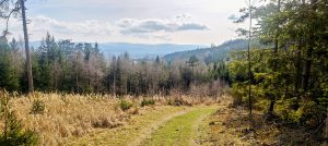 Říčej does not win on summit spectacle. There is no tower, no open lookout, and no oversized summit furniture trying to announce the place. What it does have is local presence. This wooded hill helps define the edge of the Poleňka basin and stands among the named tops of the Doubravský hřbet above the villages and folds of countryside around Chudenice and Malechov. In the summit area, the thinning and the bare March canopy opened just enough slots in the trees to show that the mountain rises distinctly above its surroundings. That was enough. On a compact forest summit like this, partial views and a convincing sense of position matter more than some forced claim of panorama.