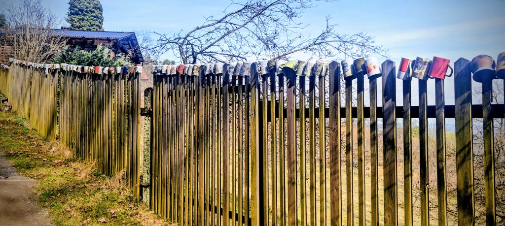I parked in the center of Struhadlo at roughly 49.389889, 13.178863, beside the bins and the village monument, then walked straight through the settlement to start the climb. The village section was short and ordinary, except for the usual chorus of dogs announcing my arrival from behind fences. One house had a line of old mugs perched along the fence, a small and slightly absurd detail that gave the start more character than most trailheads manage. Once past the last houses, the route settled into exactly the kind of terrain this hill promised: a winding forest road, steady but never serious climbing, and enough logging and fenced regrowth to keep the ascent from feeling like an untouched woodland walk. It was a compact outing from the start. I was not here for a long mountain day on one summit, just for a clean ascent that fit neatly into a larger sequence.