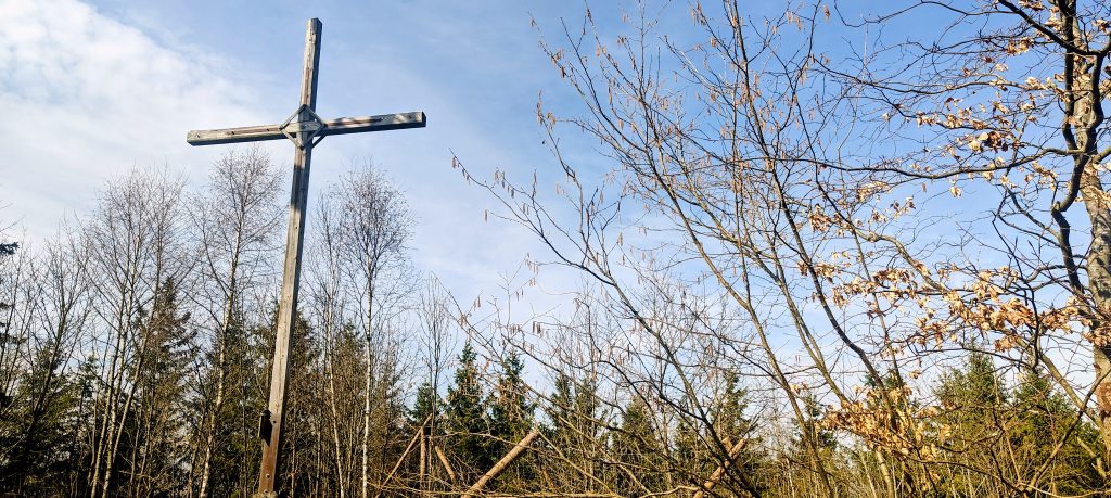 The climb reached a first convincing top at the lower south point, marked in my GPX as 693 m. On the ground, this is the place that tries hardest to pass as the summit. There is a cross, an antenna, a picnic table, and the kind of setup that would send a less stubborn peakbagger back downhill with false confidence. It is the obvious stopping point, and if I had been here only for a village walk with a viewpoint and a symbol, it would have done the job.